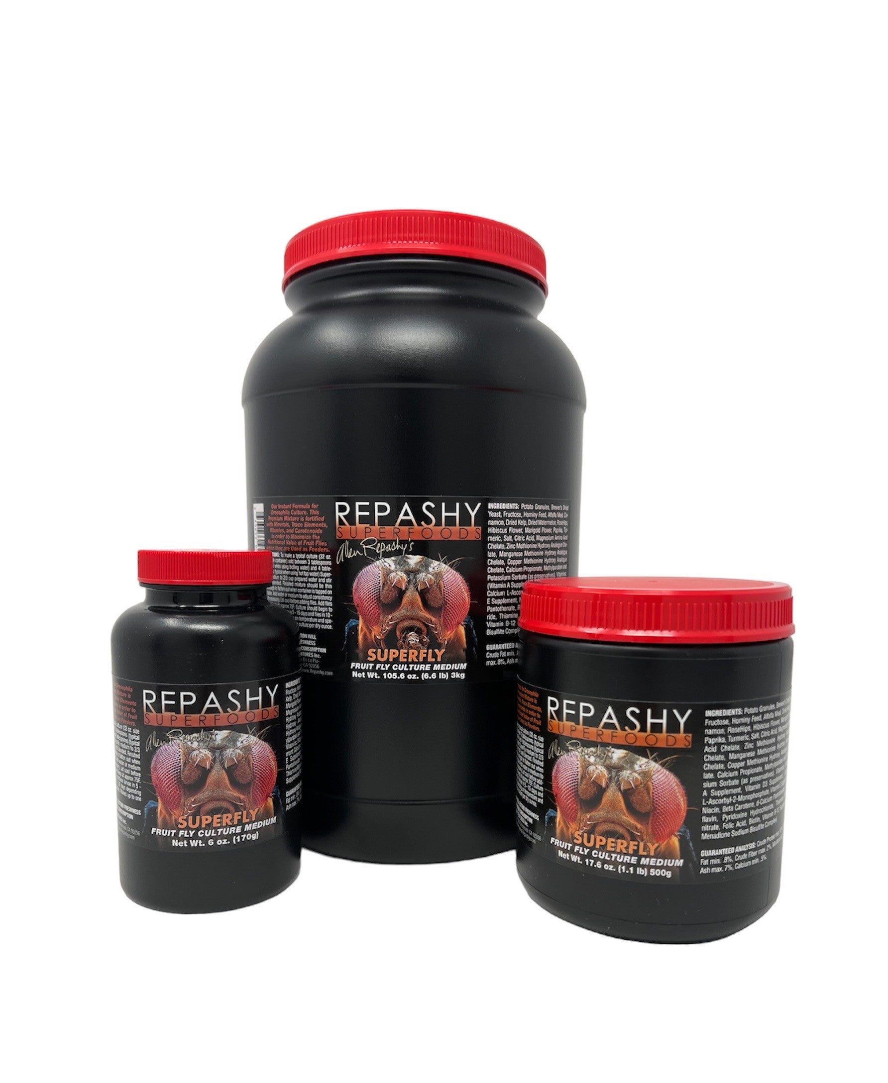 The go-to media for fruit fly cultures. Repashy Superfly provides the nutrition developing Melanogaster and Hidei fruit flies need to thrive — just mix with water, pour into your culture cup, and you're ready to seed. Available in 6oz and 17oz.